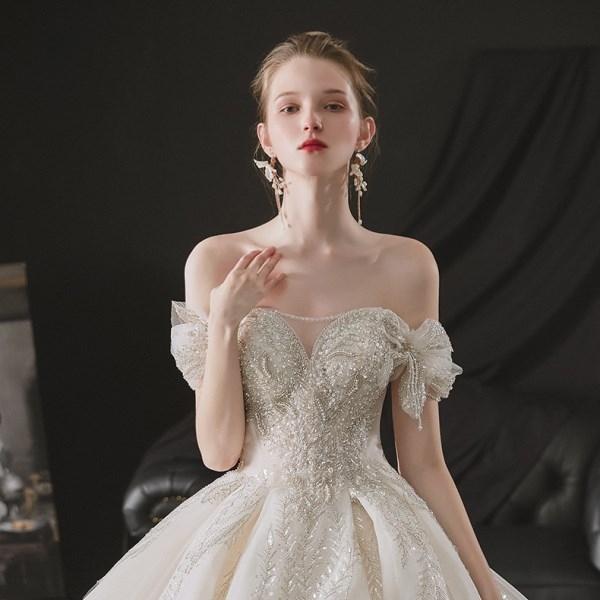 法式主婚纱新娘一字肩复古宫廷风气质超仙出门纱大拖尾秋